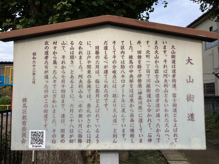大山街道は道者街道、富士街道ともよばれています。それは阿夫利山ともいわれた大山へ、また大山から富士山への道者達が通ったからです。北町一丁目で川越街道から分かれて、石神井、田無を経て伊勢原(神奈川県)に達していました。練馬の中央部をほぼ東から西南に横断して区内では約八キロメートルに及んでいます。そしてその分岐点には、「従より大山道」と刻んだ道しるべが建てられたのです。旧暦の六月は、俗に祭月とよばれているように、江戸や関東の各地では、祭礼がさかんに行なわれました。阿夫利山も「水の無い月に雨降る山は開き」とあるように、六月二十八日が初山で、それから七月十四日まで、連日、関東の村々から集った人々でにぎわいました。その白衣の道者たちが通ったのがこの街道です。