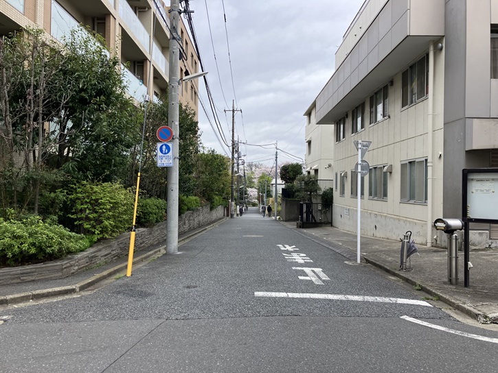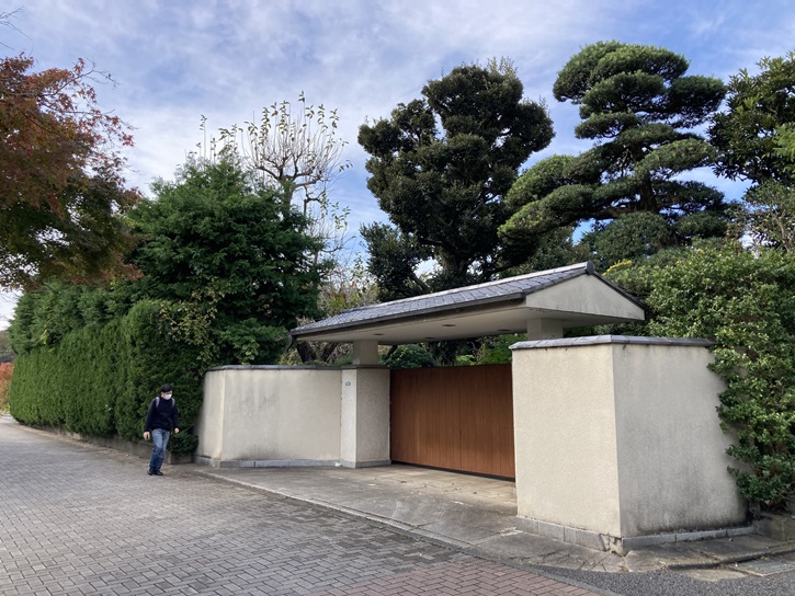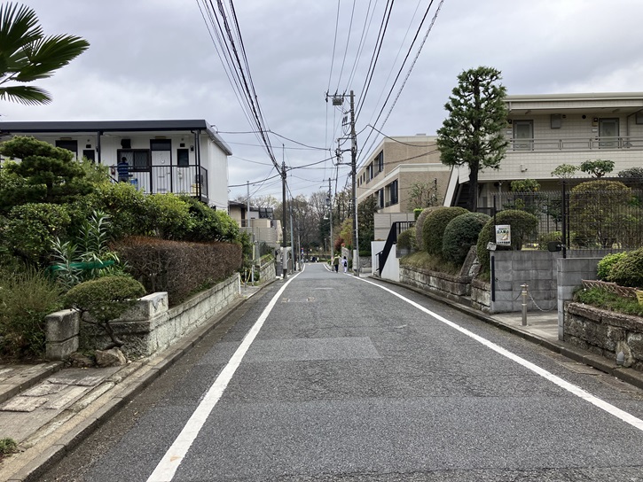 南田中橋から南田中橋北交差点を左折し、住宅地と公園の間の道を進みます。右手には瀟洒な邸宅が建並んでいます。住宅地は少し傾斜していて、ポイント10の「傾斜地と松の風景」が映えています。