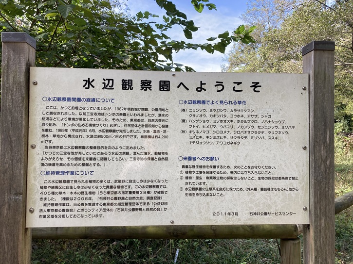 ここは、かつて釣堀となっていましたが、1987年頃釣堀が閉鎖、公園用地として買収されました。以前三宝寺池はトンボの楽園といわれましたが、湧水の枯渇などにより環境が悪化していました。そのため、東京都は、自然の復元に取り組み、「トンボの住める環境づくり」めざし、住民団体と計画段階から協議を重ね、平成元年(1989年)6月、水辺観察園が完成しました。水路・湿地・池・樹林・草地から構成され、水源は約500立方メートル/日の井戸です。総面積は約4、200平方メートルです。当時東京都は水辺観察園の整備目的を次のように定めました。「かつての三宝寺池が有していたであろう水辺の景観、澄んだ湧水、動植物をよみがえらせ、その価値を来園者に認識してもらい、三宝寺池の保護と自然回復の機運を高めるための基盤とする。