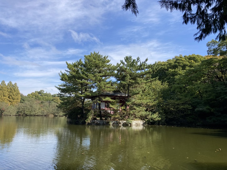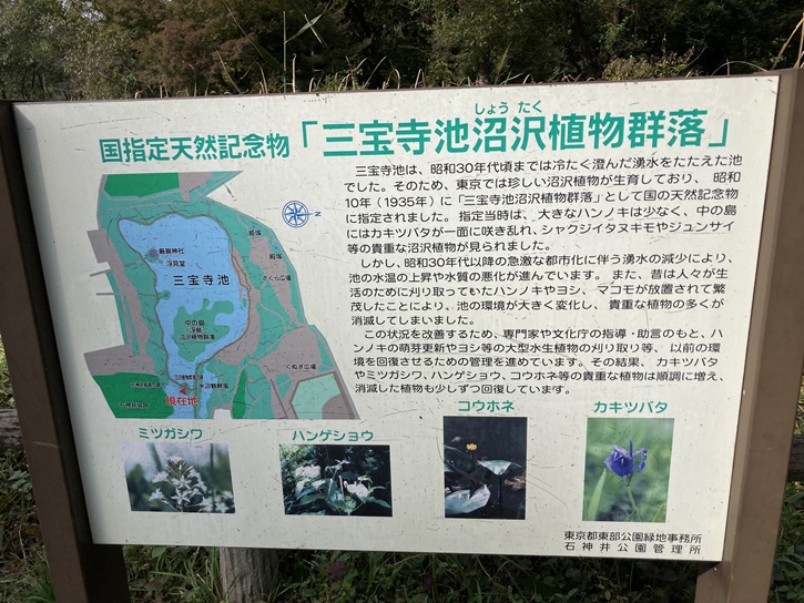 三宝寺池は、古来より武蔵野台地の地下水が水源となった池で、昭和三十四年(1959年)に人々が池周辺を散策できるように整備されました。しかし、年々池の水量は減少していて、景観維持のために人工的に地下から揚水して水面を維持しています。池の名称は隣接する三宝寺に由来しています。