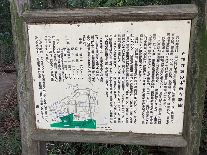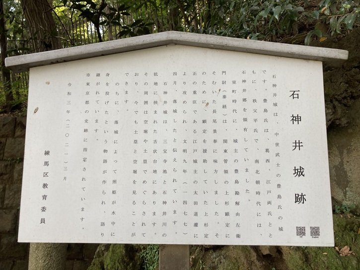 石神井城の築城時期は定かではありませんが、鎌倉時代後期頃であったとされています。この場所には、元々宇多氏・宮城氏らの館が構えられていましたが、彼らと婚姻関係を結びながら石神井川流域の開発領主として勢力を伸ばした豊島氏が城を築き、それ以降この地は豊島一族の本拠地となりました。豊島氏は新興勢力の扇谷上杉氏家宰太田氏と対立を深め、長尾景春の乱において太田道灌に攻められて落城し、その後廃城になりました。練馬区の案内板が立っています。