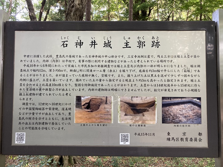 中世に活躍した武将、豊島氏の居城であった石神井城の中心部分です。三宝寺池側は崖で、残る三方には堀と土塁が築かれていました。内部(内郭)は平坦で、有事の際に利用する建物などがあったと考えられている場所です。平成十年から6年間にわたって実施した市民参加の発掘調査では堀と土塁及び内郭の一部が明らかになりました。堀は調査地点で幅約12m、深さ約6mで、断面U形に関東ローム層(赤土)を掘り下げ、底面を約3m幅で平らにした「箱堀」であることが分かりました。水が溜まっていた痕跡が無く、空堀です。また、掘り上げた土は黒土を混ぜて少しずつ固めながら内側に盛上げ、土塁を築いています。崩れていた土の量から推定すると現在より約3mも高かったと推定されます。堀と土塁を合わせると比高差10m程となり、堅固な防御施設であったことが分かります。土塁からは14世紀後半から15世紀に作られた常滑焼の甕や鉄製小刀が出土しています。内部の建物跡は明確にできませんでしたが、柱穴が発見されており小規模な掘立柱建物が建てられていたと考えられます。調査では、12世紀〜16世紀にかけての中国製陶磁器や常滑焼、渥美焼などが少量ですが出土しており、豊島氏の財力を示すとともに、生活用具の出土は内郭建物で居住していたことの可能性を示唆しています。
