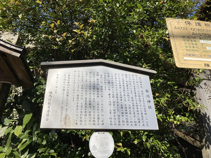 石神井城址に隣接して氷川神社が鎮座しています。氷川神社は、此の地の領主だった豊島氏が居城の石神井城の城内に大宮の氷川神社から分霊を勧請して応永年間(1394年〜1428年)に創建されました。太田道灌によって石神井城が落城した後に現在地に移転し、石神井地区の総鎮守となりました。氷川神社の特徴として境内末社が多いことが挙げられ、榛名・浅間・御嶽・阿夫利・三峰・北野・八幡・御嶽・三島・須賀・稲荷の各社があります。