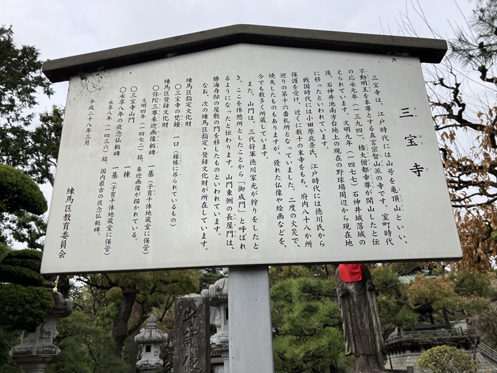 三宝寺は、江戸時代には山号を亀頂山といい、不動明王を本尊とする真言宗智山派の寺です。室町時代の応永元年(1394年)、権大僧都幸尊が開山したと伝えられています。文明九年(1477年)石神井城落城の後、石神井池南方台地上の現在の野球場周辺から現在地に移ったといわれています。戦国時代には小田原北条氏、江戸時代には徳川氏から保護を受け、近くに数十の末寺をもち、府内八十八か所巡りの第十六番札所となっていました。二度の火災で、焼失したものもありますが、優れた仏像や絵画などを、今でも数多く所蔵しています。また、山門は、三代将軍徳川家光が狩りをしたとき、ここを休憩所としたことから「御成門」と呼ばれるようになったと伝わります。山門東側の長屋門は、勝海舟邸の屋敷の門を移したものといわれています。