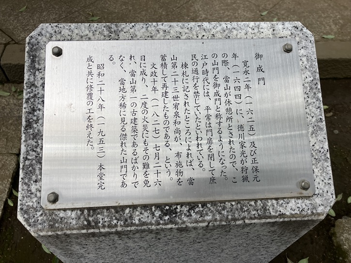 寛永二年(1625年)及び正保元年(1644年)に、徳川家光が狩猟の際、當山が休憩所とされたので、この山門を御成門と称するようになった。江戸時代には、平常は門扉を閉して庶民の通行を禁じていたといわれている。棟札に記されたところによれば、當山第二十三世宥泉和尚が、布施物を蓄積して再建したものである、という。文政十年(1827年)七月二十六日に成り、二度の火災にもその難を免れ、富山第一の古建築であるばかりでなく、當地方稀に見る傑れた山門である。昭和二十八年(1953年)本堂完成と共に修覆の工を終えた。