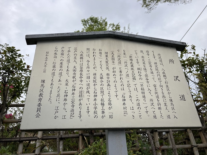 所沢道は、八成橋で杉並区から練馬区へ入ります。禅定院の門前で向きを西に変え、道場寺・三宝寺を通って、富士街道を斜断した後、南大泉を経て保谷市に入り、所沢へと通じています。概ね今の「早稲田通り」です。「新編武蔵風土記稿」では、この道のことを単に「所沢へノ道」と記してあり、はっきり「所沢道」と書かれたのは「石神井村誌」(大正四年)が初めてのようです。関東大震災後、都市計画により名称が「昭和通り」となり、大部分の区間で拡幅工事が行われましたが、禅定院から石神井小学校の間には、今も所々に旧い道が残っています。八成橋には谷原長命寺への道標があります。江戸の文人、太田南畝が「石神井三宝寺遊記」で歩んだ道でもあり、大泉・石神井から、江戸方面への産業の道であったと共に、江戸からの参詣・行楽の道でもありました。