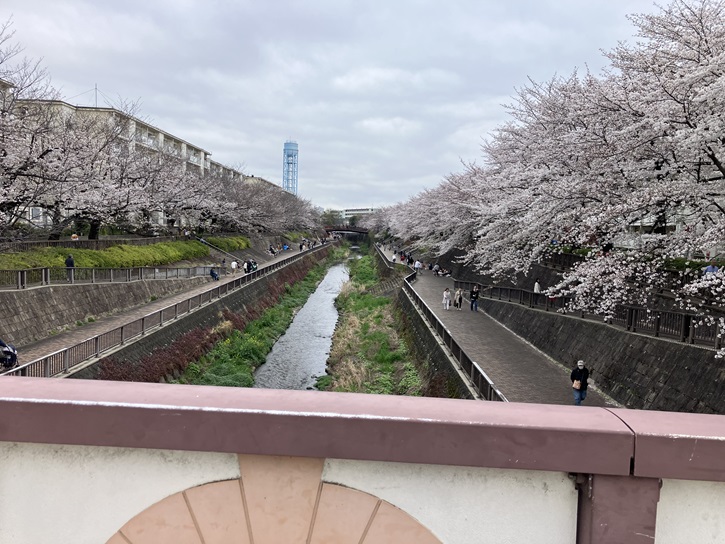 - 南田中橋に立って下流を眺めて見ると、石神井川の水面と、両岸の南田中団地の建物とサクラの並木が一体化して、印象的な河川景観を望むことができます。サクラの木と建物の高さが調和し、視線の奥にランドマークとして平成みあい橋と給水塔があることもポイントです。