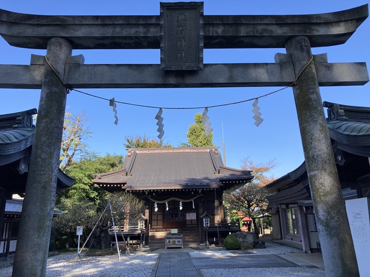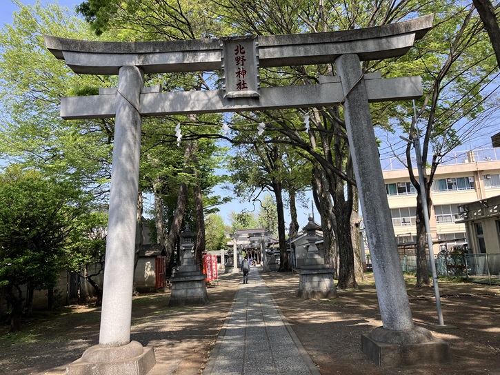 駅北口から程近い大泉小学校に隣り合って、ポイント1の「台地の縁に立つ北野神社」が鎮座しています。長〜〜〜く延びる参道には一の鳥居・二の鳥居・三の鳥居と続き、その奥に拝殿があります。