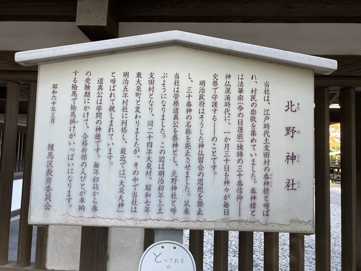 北野神社の創建年代は不明ですが、かつては「三十番神社」という名称で、土支田村の鎮守でした。明治初期の神仏分離政策によって「北野神社」と改称しましたが、明治維新以降にこの地域が「大泉」と呼ばれるようになったため、「大泉天神」という別名もあります。
