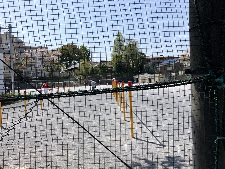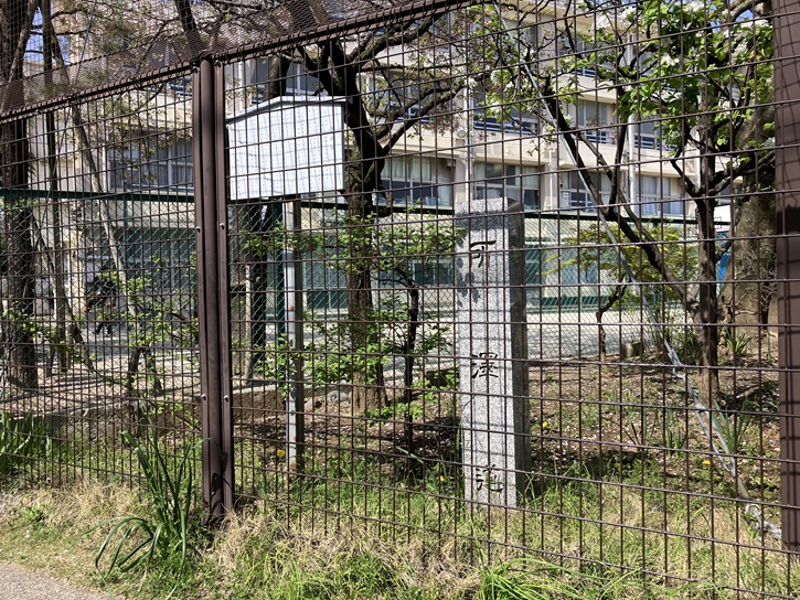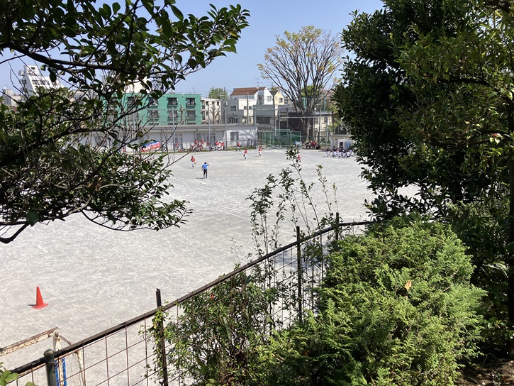 神社の裏手から大泉小学校の校庭を眺めると、北野神社が台地の縁に建っていることが分かります。この辺りは白子川の河岸段丘であることを物語っています。
