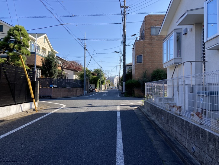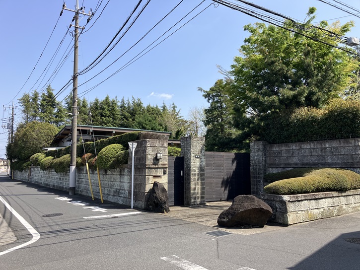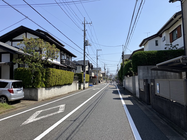 大泉学園通りの右側一帯には、ポイント2の「旧将校住宅の整った街並み」が広がっています。昭和十五年に陸軍士官学校が市ヶ谷から朝霞に移転したのに合わせて、将校用の住宅地として開発されました。東西南北にまっすぐ生活道路が延び、整った街並みを形成しています。一見すると十字路のように見えますが、地区内には道の交差が微妙にずれることによって街区ごとの閑静さが保たれている所もあります。