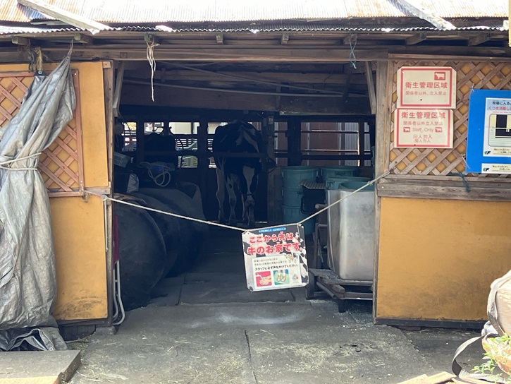 トタン小屋の中には乳牛が飼われています。その手前の小屋の中には仔牛がいますが、これは見学者と触れあうために展示されているのだそうです。