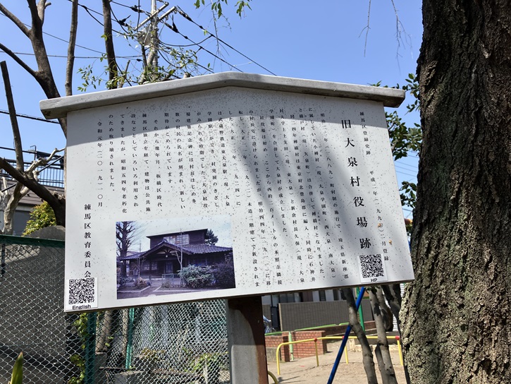 明治二十二年(1889年)町村制の施行で、埼玉県新座郡に属していた小榑村(こぐれむら:現、大泉学園町・西大泉・南大泉)と橋戸村(現、大泉町)は合併して榑橋村となりました。同二十四年榑橋村は東京府北豊島郡に編入、同時に石神井村大字上土支田(現、東大泉)と新倉村長久保(現、大泉学園町)を合併して大泉村が成立しました。村役場は初め、ここから西約二百メートルの本照寺隣接の村長宅に設けられましたが、明治四十四年(1911年)に移転し、大正十一年(1922年)木造二階建てで新設されました。大正十三年(1924年)には武蔵野鉄道東大泉駅(現、大泉学園駅)ができ、村発展のきざしがみられる時期でした。大泉村役場建築記念碑には村長はじめ多数の村民の氏名が刻まれ、新しい期待がこめられています。それから幾年月、板橋区時代、練馬区独立を経て、建物は公共施設などとしていろいろ利用されてきましたが、昭和五十四年老朽化のため取り壊されました。