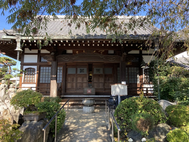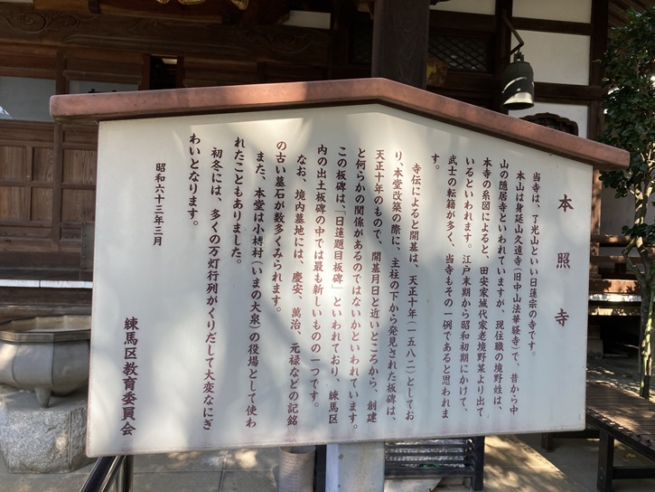 当寺は、了光山といい日蓮宗の寺です。本山は身延山久遠寺(旧中山法華経寺)で、昔から中山の隠居寺といわれていますが、現住職の境野姓は、本寺の系図によると、田安家城代家老境野某より出ているといわれます。江戸末期から昭和初期にかけて、武士の転籍が多く、当寺もその一例であると思われます。寺伝によると開基は、天正十年(1582年)としており、本堂改築の際に、主柱の下から発見された板碑は、天正十年のもので、開基月日と近いところから、創建と何らかの関係があるのではないかといわれています。この板碑は、「日蓮題目板碑」といわれており、練馬区内の出土板碑の中では最も新しいものの一つです。なお、境内墓地には、慶安、萬治、元禄などの記銘の古い墓石が数多くみられます。また、本堂は小榑村(いまの大泉)の役場として使われたこともありました。初冬には、多くの万灯行列がくりだして大変なにぎわいとなります。