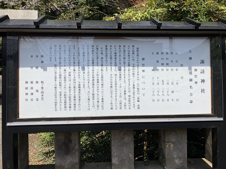 創建は明らかではありませんが、江戸時代の「新編武蔵風土記稿」には、小博村の鎮守・三十番神と記されています。元々は本照寺の北側に祀られておりましたが、明治時代の末頃に現在の地に移り奉斎されました。三十番神とは、天照大神をはじめとする三十柱の神様が一ヶ月(三十日)の間日替わりで御神威を発揮され、国土と自然をお守りするという古来からの信仰であります。そのため本殿には今も三十柱の御神像が安置されています。その後、神仏分離の際に仏教色の強かった三十番神の社号が廃される事となり、三十柱の番神のなかでもこの地に特に緑の深かった建御名方命を信州諏訪神社より勧請申し上げ、社名も現在の諏訪神社と改められました。古い土地の人々は今も「番神さま」と呼び親しんでいます。また境内には稲荷神社があり、宇迦御魂命が奉斎されています。この社は神仏分離のとき村内に散在する無格の稲荷社が合祀されたものです。拝殿には二十枚余りの絵馬が奉納されており、なかでも「狐の大根採り入れ」の絵馬は稲荷様の眷属(けんぞく:仏や菩薩に従属する使者のこと)である狐を擬人化した独特の絵柄で、貴重なものとして知られています。境内に茂る数多くの樹木は往昔の面影を良く残しています。