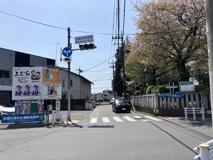 四面塔稲荷前交差点の角に稲荷神社があります。稲荷神社の創建年代等は不明ですが、江戸時代初期頃から祀られていたと伝えられています。かって此の地が小榑村小名堤、あるいは小榑村小名四面塔と呼ばれていたことから、堤稲荷とか四面塔稲荷と呼ばれています。