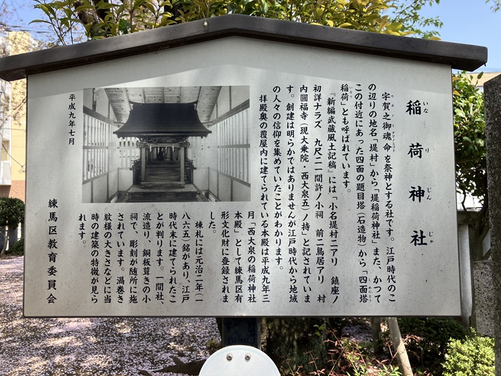 宇賀之御魂命を祭神とする社です。江戸時代のこの辺りの地名「堤村」から「堤稲荷神社」また、かつてこの付近にあった四面の題目塔(石造物)から「四面塔稲荷」とも呼ばれています。「新編武蔵風土記稿」には「小名堤村ニアリ 鎮座ノ初詳ナラズ 九尺二十一間許ノ小祠 前二鳥居アリ 村内圓福寺(現大乗院・西大泉五)ノ持」と記されています。創建は明らかではありませんが江戸時代から地域の人々の信仰を集めていたことがわかります。拝殿奥の覆屋内に建てられている本殿は平成九年三月「西大泉の稲荷神社本殿」として練馬区有形文化財に登録されました。棟札には元治二年(1865年)銘があり、江戸時代末に建てられたことが判ります。一間社、流造り、銅板葺きの小祠で、彫刻が随所に施されています。渦巻き紋様の大きさなどに当時の建築の特徴が見られます。