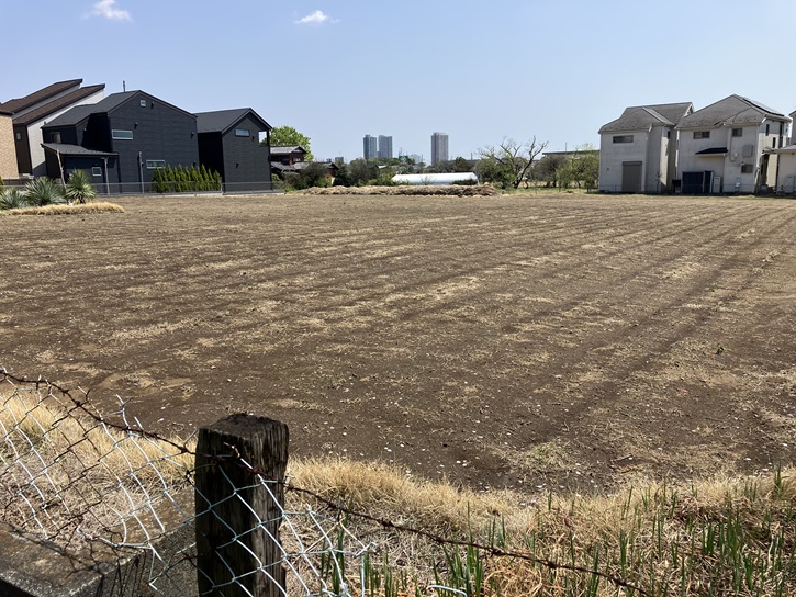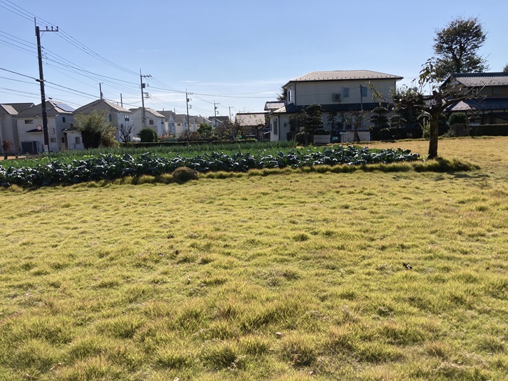 四面塔稲荷神社の南側から大泉学園駅方向を眺めますと、ポイント6の「広々とした芝畑の眺望」で、ゆめりあやリズモ大泉学園などの駅周辺の建物が望めます。芝畑は見たことがありませんでしたが、芝生の苗は畑で育てているんですね。ちなみに、芝の生産量日本一は茨城県だそうです。