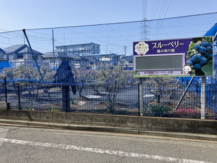 大泉交通公園の南側に隣接して永井農園があります。住宅地の中に、畑とブルーベリー園が一緒になった農地が混在するのは練馬らしい風景です。