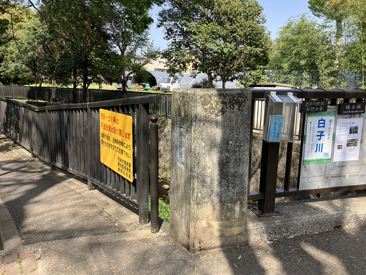 白子川は、ここから西大泉・大泉学園町・大泉町・土支田・埼玉県和光市南・白子・下新倉・板橋区成増と流れ、笹目橋付近の板橋区三園で新河岸川に合流しています。東京都と埼玉県の境は荒川だと思っていたのですが、かつての白子川の流路が現在の東京都と埼玉県の県境になっているそうです。