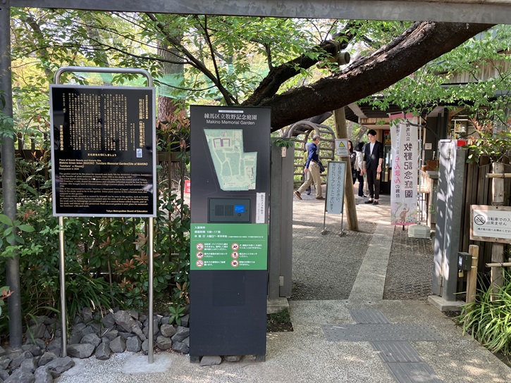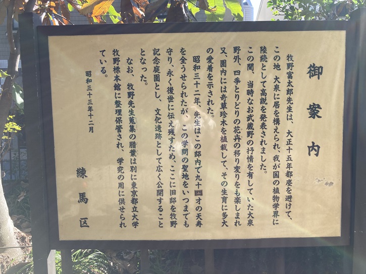 牧野富太郎先生は、大正十五年都塵を避けて、この地大泉に居を構えられ、我が国の植物学界に陸続(りくぞく:次々と)として高説を発表されました。この間、当時なお武蔵野の抒情を有していた大泉野外、四季とりどりの花卉の移り変りをも楽しまれ又、園内には奇草珍木を植栽して、その生育に多大の愛着を示された。昭和三十二年、先生はこの邸内で九十四才の天寿を全うせられたが、この学問の聖地をいつまでも守り、永く後世に伝え残すため、ここに旧邸を牧野記念庭園とし、文化遺跡として広く公開することとなった。なお、牧野先生蒐集の(さく)葉(植物を平らにひろげて押して乾燥した標本・押葉)は別に東京都立大学牧野標本館に整理保管され、学究の用に供せられている。