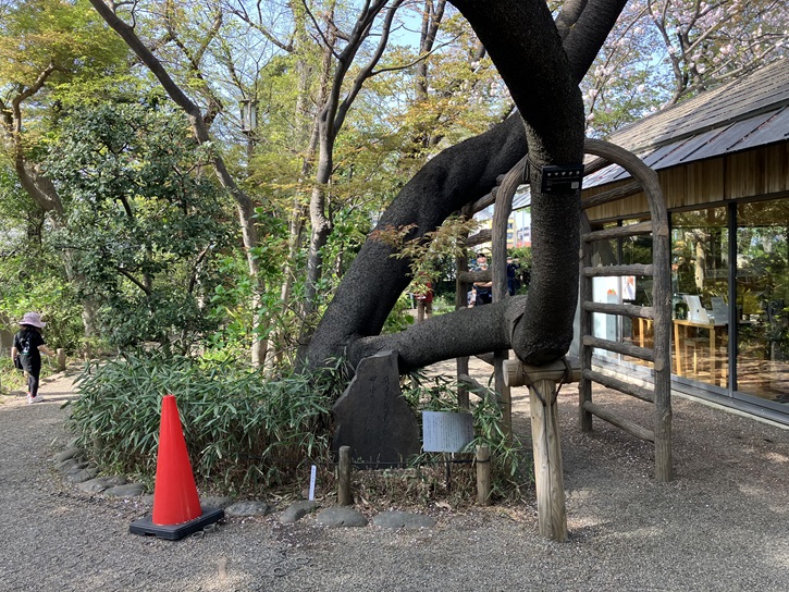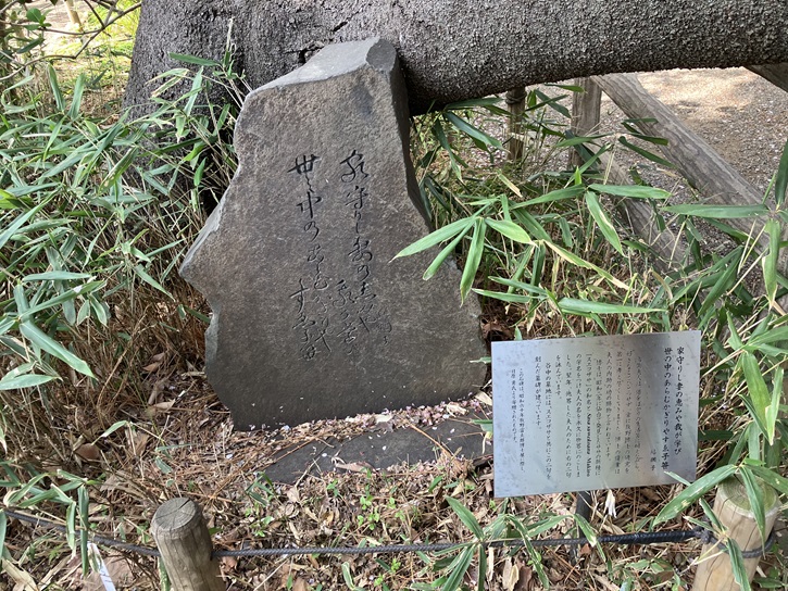 庭園の入口の先に巨大な山桜の木が枝を伸ばしています。その根元に笹が生い茂っていて、石碑が建っています。