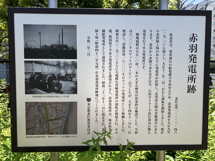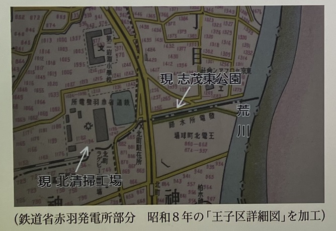 鉄道省は、電車運行の給電能力を高めるため、赤羽発電所を大正九年(1920年)に起工し、大正十二年二月一日から運転を開始しました。現在の北清掃工場のあたりに発電所が位置し、志茂東公園は水路部分にあたります。荒川から水路で水を引き込み、石炭ボイラーで高圧蒸気に換え発電を行う火力発電所です。敷地面積は5、500坪、二本の大きな煙突が印象的な施設でした。当初は6、000キロワットのタービン二台でしたが、大正十四年十一月に一台増設し、設備容量18、000キロワットの発電所として稼働しました。昭和五年(1930年)さらに大規模な川崎発電所の運転が開始され、その後、新潟県千手水力発電所等も運用されると、赤羽発電所は、渇水時等の補給発電所として運用されました。昭和三十三年十一月に廃止され、北清掃工場(昭和四十三年完成)が赤羽発電所跡地につくられました。