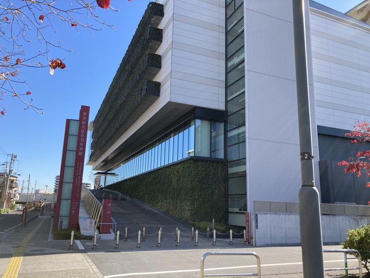北区立赤羽体育館は、平成二十九年2月にオープンした区内で3番目となる総合体育館です。鉄骨鉄筋コンクリート・地下1階・地上4階の建物内に、バスケットボールやバレーボールなどのスポーツに利用できる大小2つのアリーナやトレーニングルーム、弓道場、スタジオ、多目的室などの設備が整っています。体育館横の階段を上がった先には広いテラスがあり、隅田川の川面を眺めることができます。ちょっと殺風景ですが。