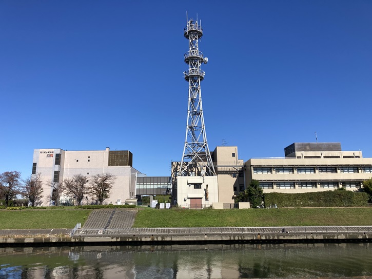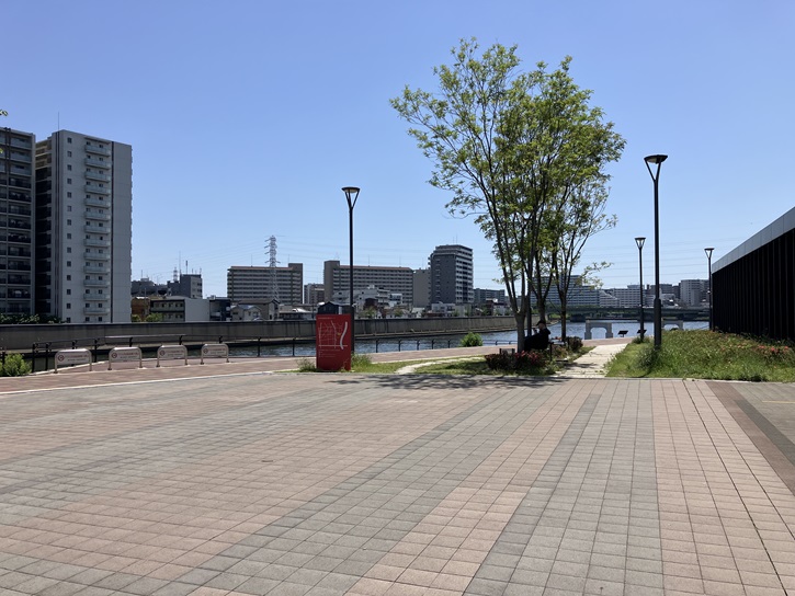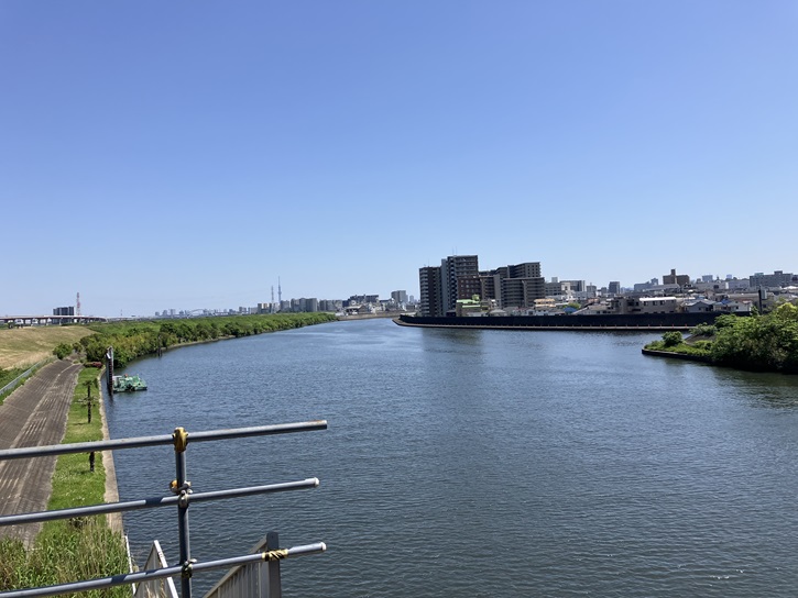 志茂ゆりの木公園を出て横断歩道を渡った先から新河岸川沿いの歩道を進みます。新河岸川はすぐ下流で隅田川に合流しています。新河岸川の対岸には、国土交通省関東地方整備局荒川下流河川事務所の鉄塔が聳えています。