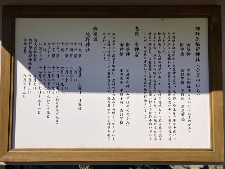 荒川放水路は明治・大正時代まで、東京都・埼玉県一帯が大雨により度々洪水に見舞われ、住民は毎年悲惨な思いをして来た過程で建設されました。椰木野原とは荒川の対岸にあって、下村の飛地として放水路の出来るまで水田、畑として作物を生産していました。その地に当社は当時まで鎮座し、五穀豊穣と家内繁栄を願い村人の信仰を仰いでいましたが、放水路の建設により現在の地に移築されました。