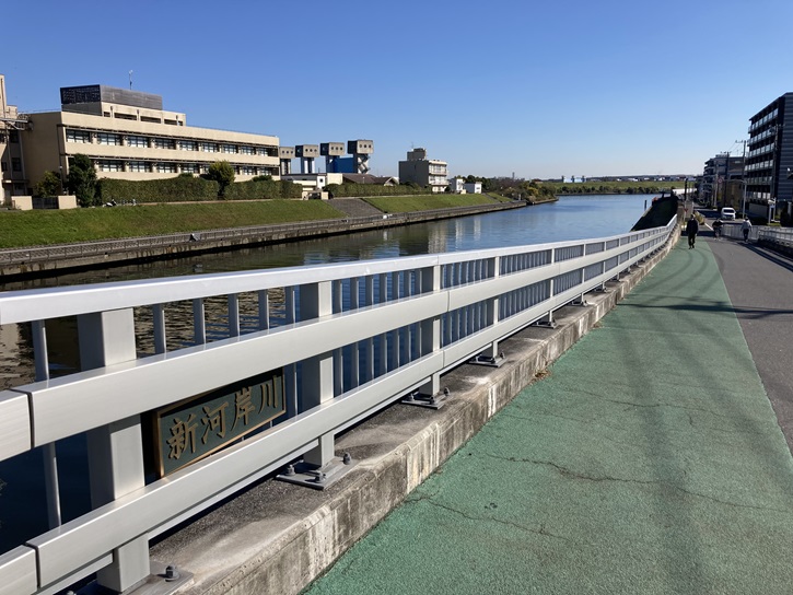 八雲神社から戻って荒川沿いの歩道を上流方向に進みます。新河岸川に架かる新荒川大橋の袂が東京都と埼玉県の境界になります。新荒川大橋と名前が付いているのは、この橋が荒川と新河岸川の両方の川を連続して跨いでいるからです。尚、東京都側の道路は「北本通り(きたほんどおり:”きたもとどおり”ではありません)」という名称で、埼玉県側の道路は「国道122号岩槻街道」となっています。