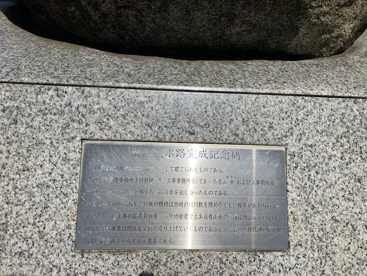 この碑は荒川放水路の完成を記念して建てられたものである。荒川下流改修事務所主任技師(現工事事務所長)であった青山士(あきら)および工事関係者一同が工事の爆牲者を弔うために資金を出し合ったものである。台座は富士川の転石を、銘板の模様は当時の河川敷を埋め尽くした桜草があしらわれている。この工事の最高責任者であり功労者でもある青山士の名前は刻まれていない。巨大な土木事業は関係者全員で造り上げていくものであるという青山主任技師の精神が簡潔に記されているとして著名である。