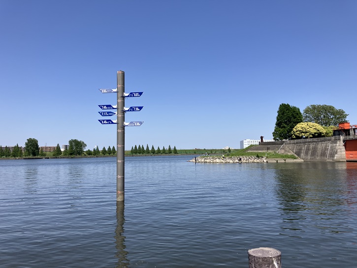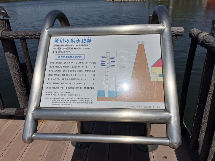 川の中にポールが立っています。荒川の過去の洪水時の最高水位を表示したものだそうです。