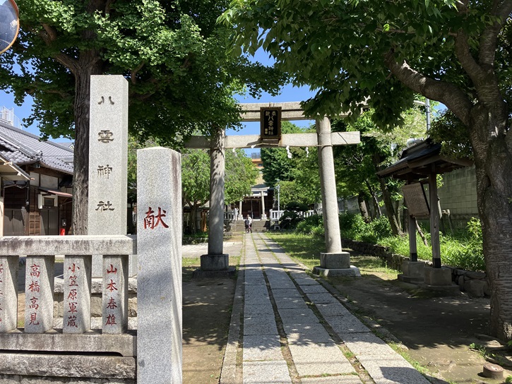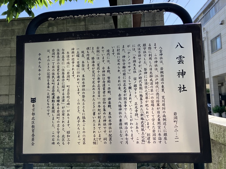 八雲神社は、岩槻街道の東裏、荒川堤防の南側近くに鎮座します。この神社は、江戸時代に徳川将軍が日光東照宮に参詣する際に利用した日光御成道の第一の宿場として栄えた岩淵宿の鎮守社でした。祭神には須佐之男尊が祀られています。創建年代は不祥ですが、江戸時代後期に編纂された「新編武蔵風土記稿」には、「牛頭天王社 宿ノ鎮守トス、正光寺持、」とあり、これが「テンノウサマ」として親しまれていたことがわかります。また、神仏分離以前には正光寺が別当寺でした。明治六年七月に村社に定められ、それ以来、赤羽八幡神社の兼務社となっています。境内には、本殿、幣殿・拝殿、神楽殿、末社水神社が配置されています。水神社は舟運業者の信仰を集めた神社です。祠の右側には「寛政十二庚申正月吉日」の年紀が刻まれています。また、勝海舟が荒川で足止めされたときに書いたとされる大幟旗も所蔵します。現在、本祭は、末社水神社の祭礼とともに隔年ごとの六月第一土曜・日曜に行われています。このとき、氏子たちによって神輿が巡幸されます。参道の端に「岩淵町 町名存続之碑」があります。昭和三十七年五月に「住居表示に関する法律」が公布されると、北区も住居表示の変更を進めました。由緒ある岩淵町の名を守るため、岩淵町一丁目の住民は町名存続運動を展開しました。この石碑は、そのときの記憶を未来へと刻むものです。