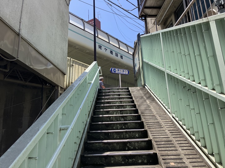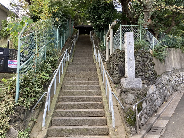 路地を進んだ先に階段が上がっています。階段の上に案内板があり、静勝寺からこの地点までのルートは「稲付の小径」という散歩道だったことが分かります。コースの見所が紹介されていて、こちらから歩いた方が良かったですね。