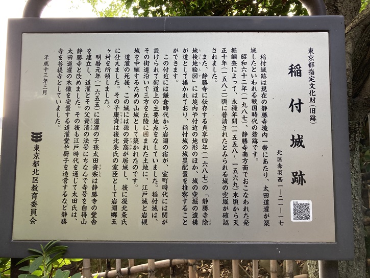 稲付城跡は、武蔵野台地北東端部の標高21m程度の舌状台地先端上に立地する自然地形を利用した中世の城館跡です。文化・文政期の地誌「新編武蔵風土記稿」にも「堀蹟」として登場します。現在静勝寺が所在する平坦面に主郭があったと考えられています。北面と東西面は崖面で、南側は台地が続き平坦な地形になっています。周辺からは、発掘調査によって幅約12m、深さ約6mの空堀の跡等が検出され、その際に十六世紀前半頃の遺物が出土しました。静勝寺には室町時代の武将、太田道灌の木造坐像が所蔵されています。寺伝によれば、城はこの道灌による築造とされています。今のところ築城した人物を特定する明確な根拠はありませんが、荒川を前面にひかえ北方の防御を重視した城の構造と、発掘調査の成果などから、南側に勢力をもった扇谷上杉氏にかかわりのある城館であったと推測されます。道灌が扇谷上杉氏の家宰であったことから、道灌築城の可能性も考えられます。