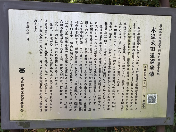 右手の道灌堂の厨子内には、太田道灌の坐像が安置されています。像は、道灌の命日である七月二十六日にちなんで毎月二十六日に開扉されます。道灌堂は道灌の二百五十回忌にあたる享保二十年(1735年)七月に建立され、厨子は三百五十回忌にあたる天保六年(1835年)七月に製作されました。太田道灌(1432年〜1486年)は室町時代の武将で、扇谷上杉家に仕えて三十余度にも及ぶ合戦に参加したといわれますが、長禄元年(1457年)四月に江戸城を築いたことで知られています。像は頭を丸めており、道灌が剃髪した文明十年(1478年)二月頃から同十八年に没するまでの晩年の姿を映しています。体には胴服を着けており、左脇には刀一振が置かれています。正面を向き、右手で払子を執って、左手でその先を支え、左膝を立てて畳座に坐しています。像高は44.5センチ、構造は檜材の寄木造です。頭部は前後二材矧ぎで玉眼を嵌入し、差首としています。胎内に納入されていた銘札によると、元禄八年(1695年)静勝寺第六世の風全恵薫によって造立され、以後、六回の修復が施されました。現在の彩色は、昭和六十二年(1987年)四月に行われた修復によるものです。像は、道灌が没してから二百年以上も後に造立されたものではありますが、その風貌を伝える唯一の木像として大変に貴重で、平成元年(1989年)一月に北区の指定有形文化財に指定されました。
