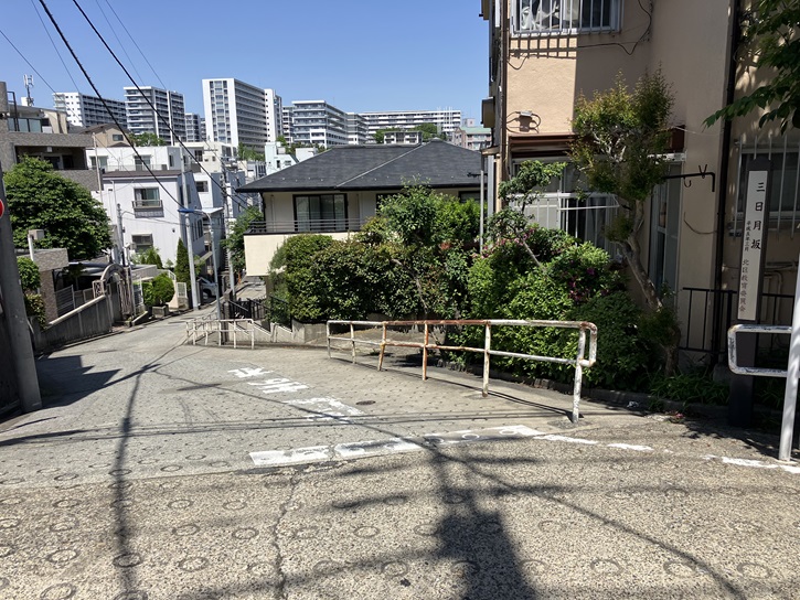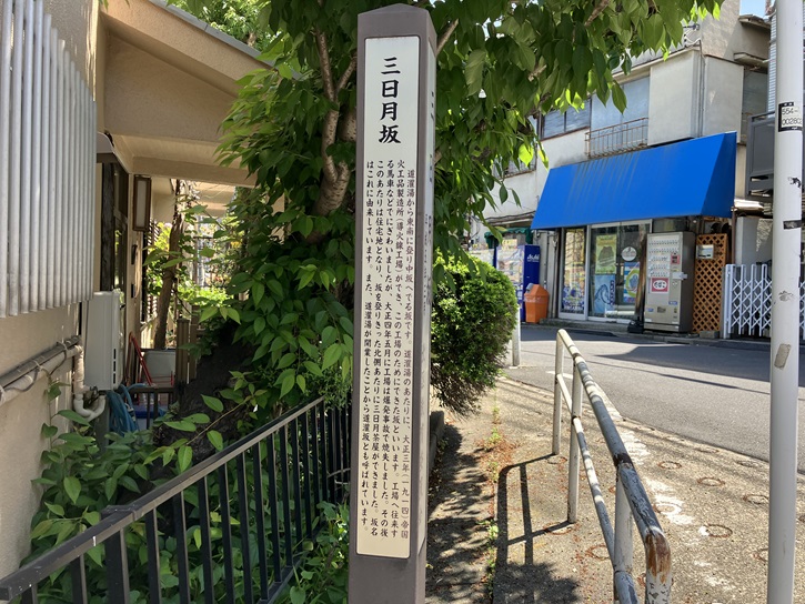 中坂の坂上から右手に急坂が下っています。三日月坂は長さが約80mほどの急な坂で、別名を「道灌坂」といいます。坂名は、坂上の北側に三日月茶屋があったことに由来します。別名の道灌坂は、2006年に廃業した「道灌湯」に因んでいます。坂上に案内柱が立っています。