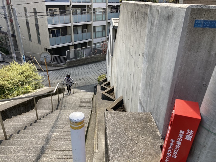 このコースは、階段や坂が多いのが特徴です。中坂は長さが約180mほどの左に曲がりながら上がる急な坂です。中坂は江戸時代からの古道で、昔は普門院の裏手から真正寺坂に出る小道でした。中坂の坂下近くに中坂と真正寺坂を繋ぐ階段があります(写真奥の左手の階段)。この階段は、江戸時代には中坂と真正寺坂の高低差7mほどを結ぶ急坂のようになっていました。明治時代に一旦消滅し、昭和初期に階段になって復活したものと思われます。