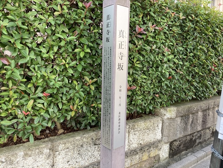 岩槻街道沿いの赤羽西派出所から西へ登る坂です。坂の北側(赤羽西二丁目14−6付近)に普門院末の真正寺がありましたが、廃寺となり、坂名だけが残りました。坂の登り口南側にある明和六年(1769年)十一月造立の庚申塔に「これよりいたはしみち」と刻まれていて、日光御成道(岩槻街道)と中山道を結ぶ道筋にあたっていたことがわかります。かつて、稲付の人びとは縁起をかついで「しんしょう(真正/身上)昇る」といって登ったそうです。