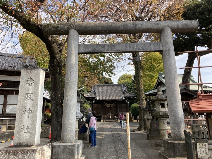 曲がりくねった路地の先の高台に、稲付村の鎮守だった香取神社があります。香取神社の創建年代は不明ですが、奥殿の中にある朱塗りの本殿はかつて上野東照宮の内陣だったものを徳川家光の霊夢により香取神社に移したものといわれていて、その頃には既に存在していたものと推測されています。