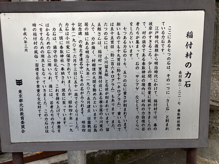 境内には7個の力石が置かれています。軽いもので約71kg、重いものですと約206kgあるそうです。