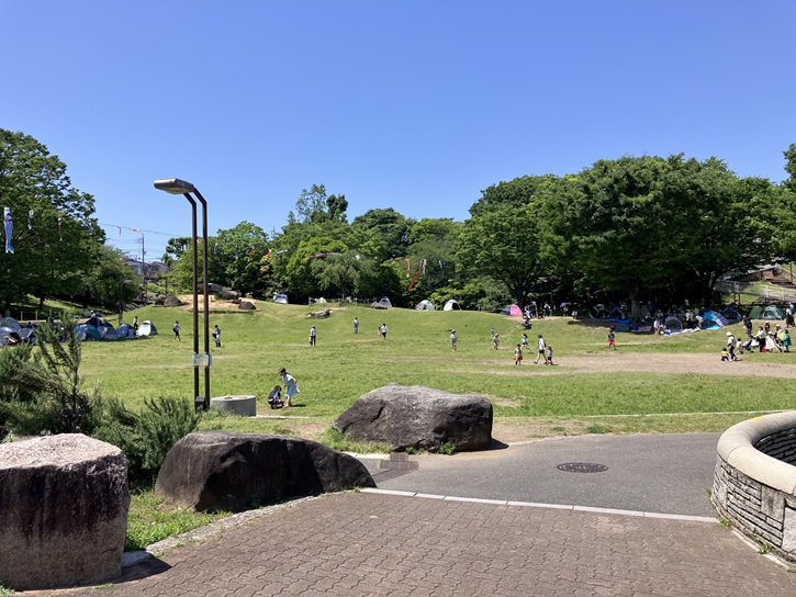 - 芝生公園は約4、500uあり、長さ52mのすべり台や広い斜面を利用して流れる川、自然ふれあい情報館など、楽しい設備がたくさんあります。