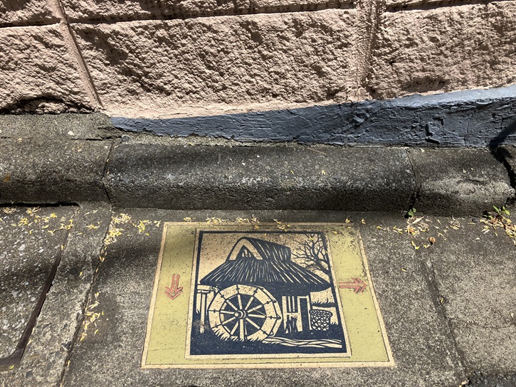 水車小屋のイラストが描かれたタイルが貼られています。この辺りは武蔵野台地の崖線に位置していますので、台地の地下を通ってきた伏流水が崖下で川となり、水車を廻すほどの流れになっていたのでしょう。