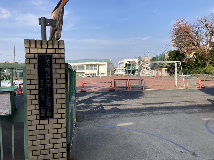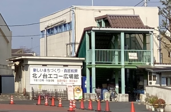 姥ヶ橋交差点で環七に出ます。環七を東方向に少し進んだ先の左手に北ノ台スポーツ多目的広場があり、その一画に「北ノ台エコー広場館」があります。北ノ台エコー広場館は、平成八年3月に学校の廃校利用としてオープンしました。学校給食の残菜を利用した「有機野菜販売」、家庭から出された不用品の「多々楽市」、区民参加の「フリーマーケット」、「まな板削り」、「包丁研ぎ」などに利用されましたが、建物の老朽化に伴い、令和五年3月31日をもって閉館しました。