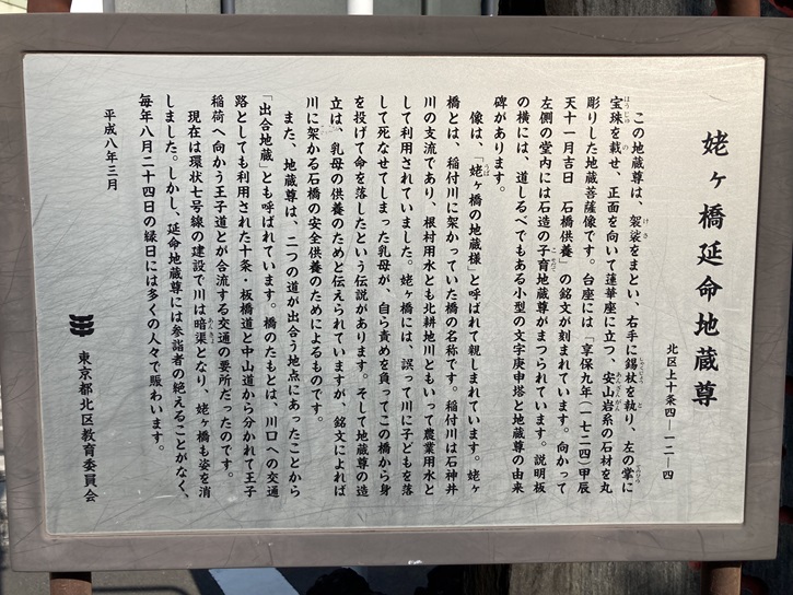 この地蔵尊は、袈裟をまとい、右手に錫杖を執り、左の掌に宝珠を載せ、正面を向いて蓮華座に立つ、安山岩系の石材を丸彫りした地蔵菩薩像です。台座には「享保九年(1724年)甲辰天十一月吉日 石橋供養」の銘文が刻まれています。向かって左側の堂内には石造の子育地蔵尊がまつられています。説明板の横には、道しるべでもある小型の文字庚申塔と地蔵尊の由来碑があります。像は、「姥ヶ橋の地蔵様」と呼ばれて親しまれています。姥ヶ橋とは、稲付川に架かっていた橋の名称です。稲付川は石神井川の支流であり、根村用水とも北耕地川ともいって農業用水として利用されていました。姥ヶ橋には、誤って川に子どもを落して死なせてしまった乳母が、自ら責めを負ってこの橋から身を投げて命を落したという伝説があります。そして地蔵尊の造立は、乳母の供養のためと伝えられていますが、銘文によれば川に架かる石橋の安全供養のためによるものです。また、地蔵尊は、二つの道が出合う地点にあったことから「出合地蔵」とも呼ばれています。橋のたもとは、川口への交通路としても利用された十条・板橋道と中山道から分かれて王子稲荷へ向かう王子道とが合流する交通の要所だったのです。現在は環状七号線の建設で川は暗渠となり、姥ヶ橋も姿を消しました。しかし、延命地蔵尊には参詣者の絶えることがなく、毎年八月二十四日の緑日には多くの人々で賑わいます。