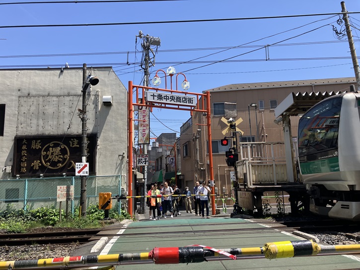 埼京線の線路を越えて十条中央商店街に入ります。ホームが道路の際際まで迫っていますね。