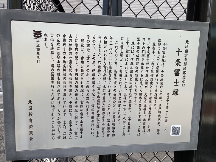 十条冨士塚は、十条地域の人々が、江戸時代以来、冨士信仰にもとづく祭儀を行って来た場です。現在も、これを信仰対象として毎年六月三十日・七月一日に十条冨士神社伊藤元講が、大祭を主催し、参詣者は、頂上の石祠を参拝するに先だち線香を焚きますが、これは冨士講の信仰習俗の特徴のひとつです。塚には、伊藤元講などの建てた石造物が、三十数基あります。銘文によれば遅くとも、天保十一年(1840年)十月には冨士塚として利用されていたと推定されます。これらのうち、鳥居や頂上の石祠など十六基は明治十四年(1881年)に造立されています。この年は、冨士講中興の祖といわれた食行身禄、本名伊藤伊兵衛の百五十回忌に当りました。石造物の中に「冨士山遙拝所再建記念碑」もあるので、この年、伊藤元講を中心に、塚の整備が行われ、その記念に建てたのが、これらと思われます。形状は、古墳と推定される塚に、実際の富士山を模すように溶岩を配し、半円球の塚の頂上を平坦に削って、富士山の神体の分霊を祀る石祠を置き、中腹にも、富士山の五合目近くの小御岳神社の石祠を置いています。また、石段の左右には登山路の跡も残されており、人々が登頂して富士山を遥拝し、講の祭儀を行うために造られたことが知られます。