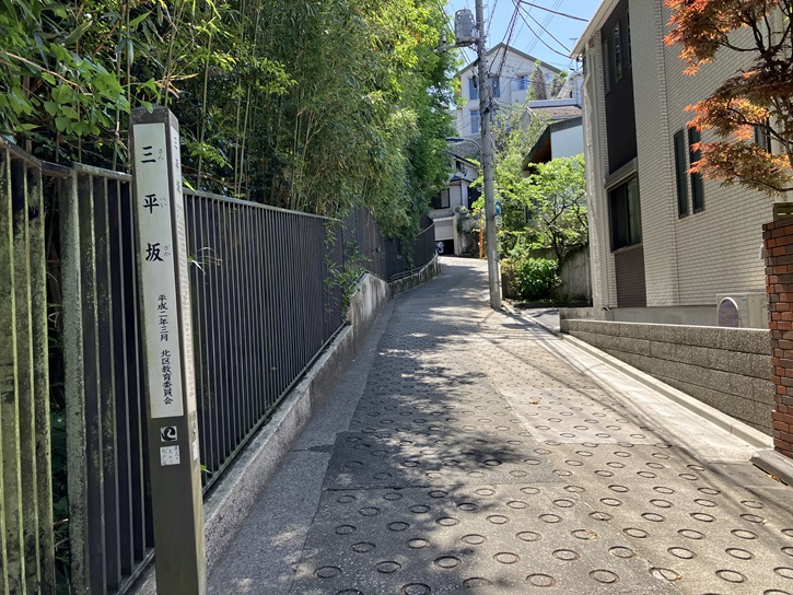 名主の滝公園の北端に沿って台地へ登る曲がりくねった坂道である。坂名の由来は、江戸時代の絵図にある三平村の名からとも、室町時代の古文書にある十条郷作人三平の名からともいわれている。農家の人が水田へ下る通路であったが、名主の滝への道としても利用されたようである。