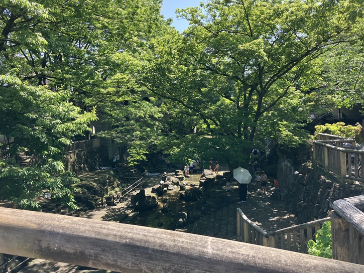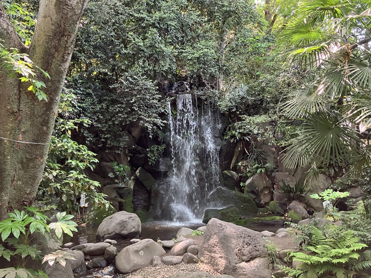 園内は回遊式の庭園となっていて、男滝・女滝・独鈷の滝・湧玉の滝の4つの滝が復元されています。これらの滝は地下水をポンプで汲み上げて水を流していて、滝から流れた水は小川となって園内を巡り大小の池に注ぐ仕組みになっています。